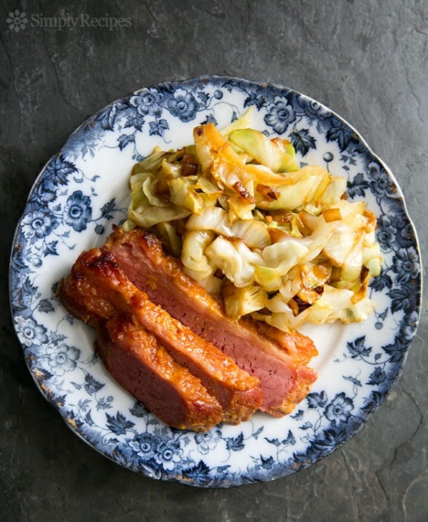 The traditional way to prepare corned beef and cabbage is to boil it, both the beef and the cabbage. Several years ago my friend Suzanne introduced me to her favorite way of making the corned beef—speckled with cloves, slathered in honey mustard and baked, served alongside sautéed cabbage.